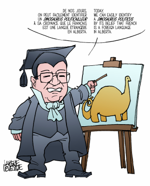 De nos jours, on peut facilement identifier un dinosaurus politicailleur à sa croyance que le français est une langue étrangère en Alberta. (bil.)